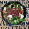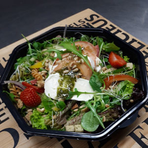 Een vegetarische salade met verse sla, rucola, pasta, rauwkost en croutons.